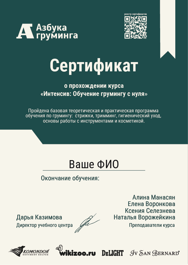 Сертификат учебного центра "Азбука Груминга"